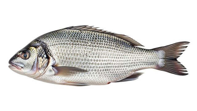 A silver fish with dark fins and tail on a white background