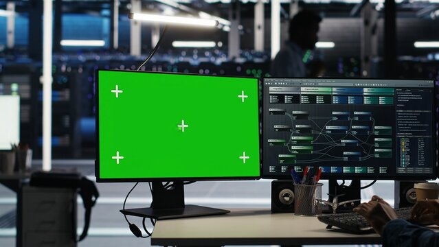 Server farm engineer using node tree systems on green screen PC to categorize unstructured data. Data center IT expert uses visual programming software on mockup chroma key computer, camera B