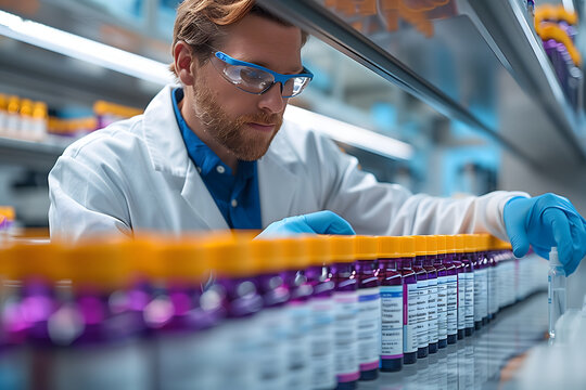 Scientist in Lab Coat and Goggles Working on a Shelf