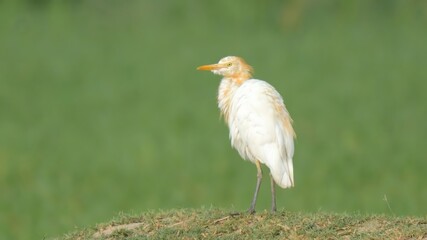 White and yellow heron, yellow bill, legs. Often seen near grazing livestock. Wetlands, grasslands. Feeds on insects, vertebrates disturbed by cattle.
