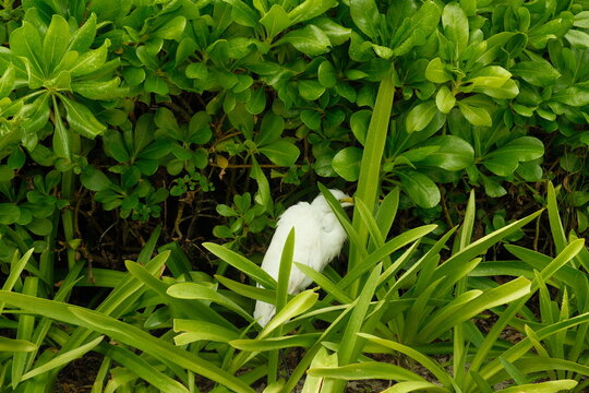 White cattle egret bird with yellow beak hiding in the bushes during rain