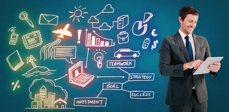 Caucasian Businessman Analyzing Data On Tablet With City Background Images