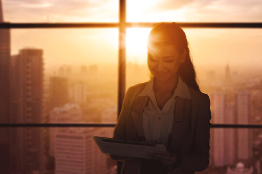 Smiling woman using a digital tablet for work or leisure, connecting with technology. Transparent background
