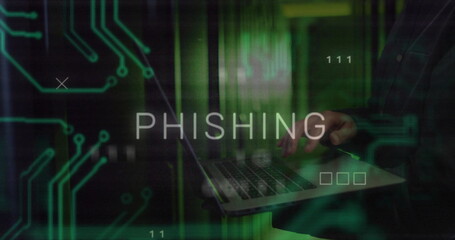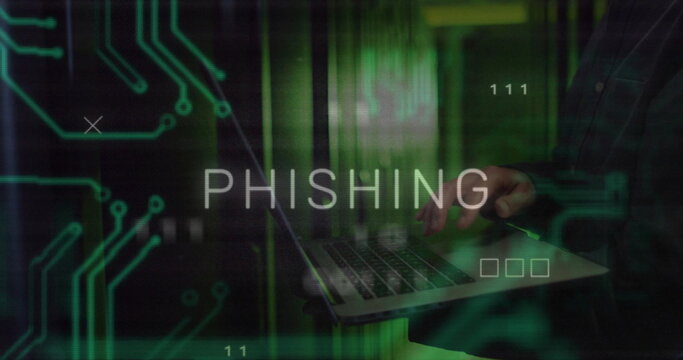 Image of phishing text over data processing and caucasian male worker in server room