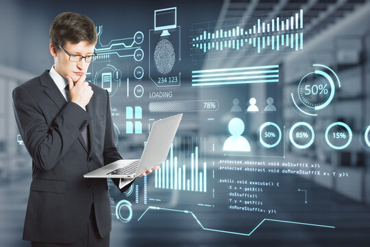 businessman using laptop with creative glowing business chart interface hologram on blurry office interior background. Company digital data, guide and computer analysis concept. Double exposure.