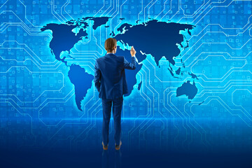 Thoughtful young european businessman standing inside abstract cube hologram on blurry blue background. Metaverse, software, future and data center concept. Double exposure.