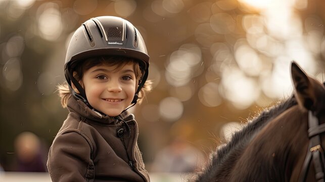 Girl horse rider on the green field. Trees in the background. Equestrian theme.