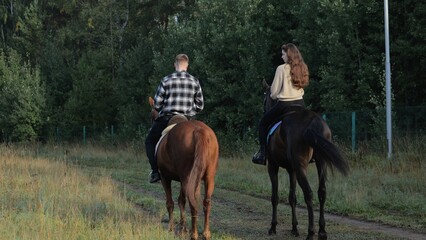 Middle-aged equestrians enjoying a conversation while horseback riding outdoors