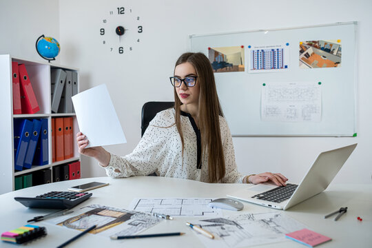 Caucasian Female Architect Designing Plans At Drafting Table Images