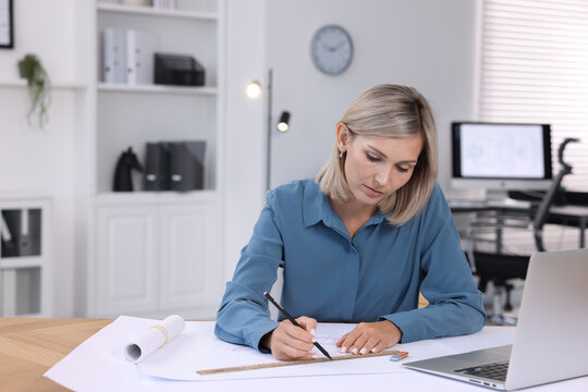 Female architect drawing blueprints in office, designer drafting construction plans.