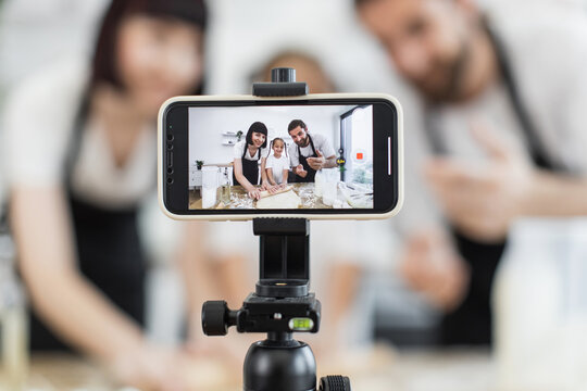 Female pastry chef smiling as she kneads dough, with her mobile phone on a tripod recording every step, creating engaging content for her baking vlog.
