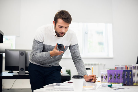 A young architect working on his construction model while talking to someone over the phone using the speaker mode
