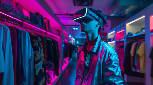 A young man is immersed in virtual reality while wearing a headset inside a closet, neon light
