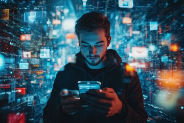 Caucasian man in metaverse using smartphone with animated interfaces, visualizing web network
