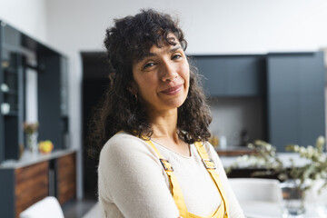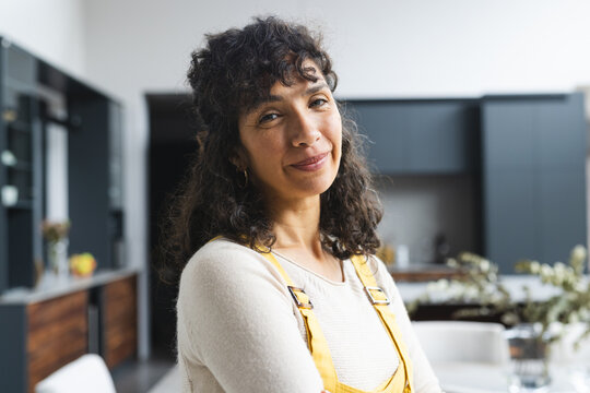 Portrait of happy mature caucasian woman with long dark curly hair smiling in dining room