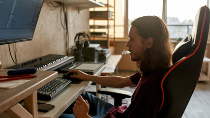 Bored, tired caucasian male musician, a sad, handsome portrait of a middle-aged pianist playing a somber song at a piano in an acoustic, indoor music studio