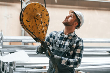 Professional caucasian white ethnicity male technician operating the heavy duty machine in the lathing factory. Technician in safety and helmet suit controlling a machine in factory.