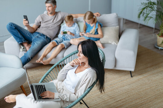 Happy young mother and her children using a smartphone on the couch in the living room at home