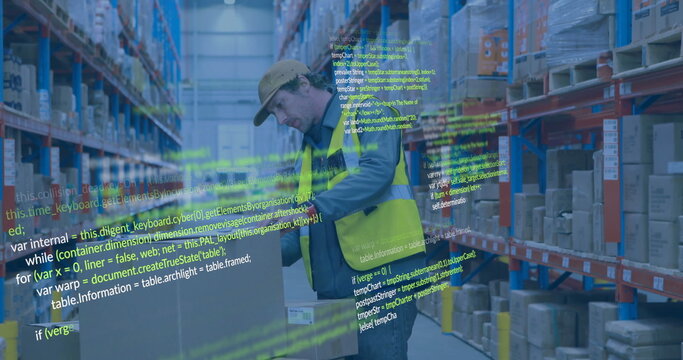 Warehouse workers analyzing data on laptop overlaid with code snippets, technology in logistics