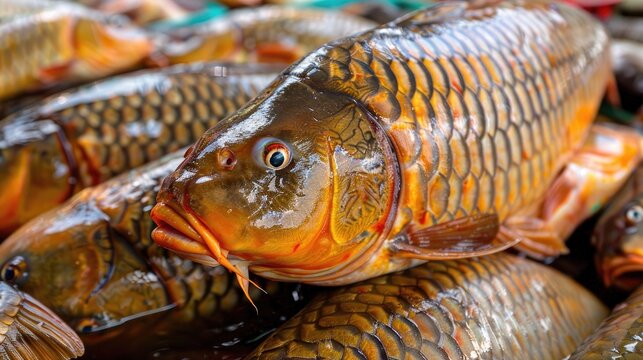 Freshly caught catla rohu carp fish available at Asian fish market in high definition