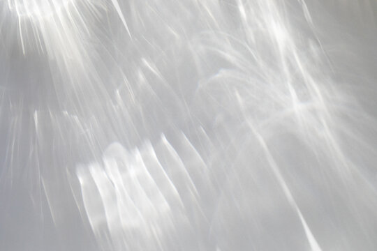 Caustic effect light refraction on white wall overlay photo mockup, blurred sun rays refracting through glass prism with shadow. Abstract natural light refraction silhouette on water surface mock up.