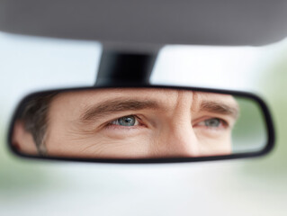 Driver advice reflection in rearview mirror with focused eyes showing concentration and careful attention