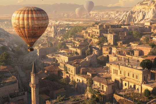 Breathtaking cappadocia landscape featuring hot air balloons and ancient cave dwellings in turkey