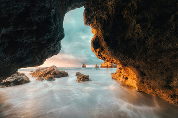 View from the cave a sandy beach along the ocean at sunset