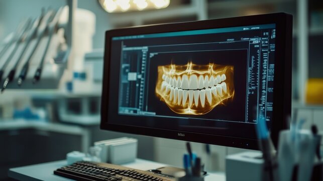 An office in a dental clinic, computerized 3D tomography of teeth and jaw.