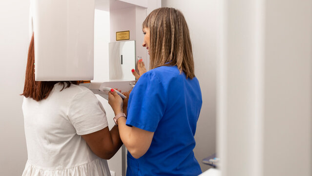 A dentist woman setting up the cbct scanner for one of their clients at the dental clinic