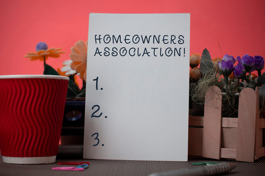 Handwriting text writing Homeowners Association. Conceptual photo Organization with fee for upkeeps of Gated Community Flowers and stationary plus plain sheet with paper big cup above a table