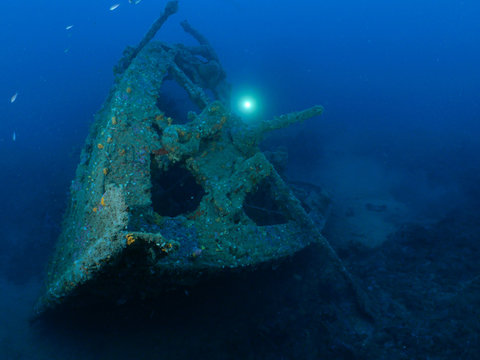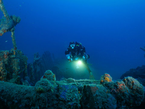 Tek diver with a rebreather visiting Levanzo wreck close to Sudan