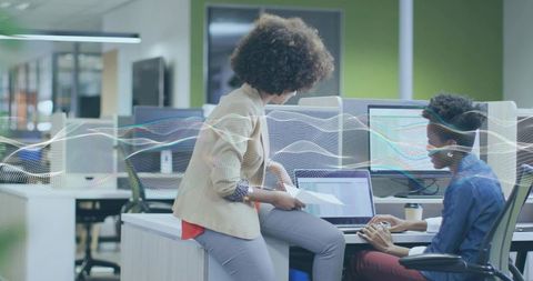 Collaborating black women at open-plan office reviewing laptop data and printed reports