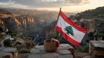 Flag Lebanon waving proudly on wooden pole beside wicker basket overlooking dramatic Qadisha Valley canyon with golden sunset illuminating ancient stone villages and terraced cliffs