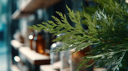 Close-up of a vibrant green cedar branch, set against a softly blurred background of shelves filled with containers, exuding a tranquil and natural atmosphere.