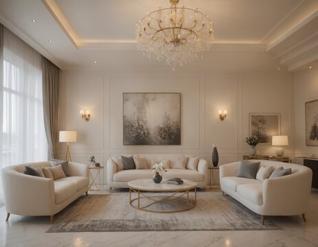 Neoclassical grand hall with crystal chandeliers and marble corridor, palatial interior