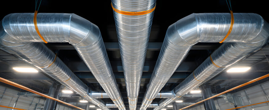Factory ventilation ductwork securely mounted along the high ceiling for efficient airflow management