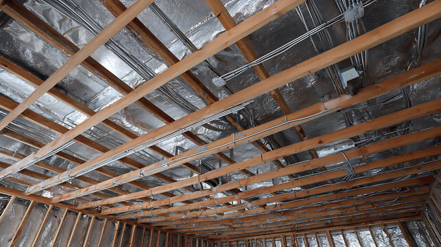 Exposed wooden beams with silver insulation and electrical conduits ceiling structure construction