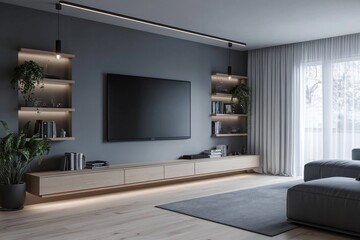 Featuring beige sectional sofa facing wall-mounted tv with illuminated built-in shelving