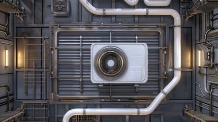 A modern building interior with an air conditioning unit mounted on the ceiling and exposed ductwork