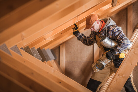 A construction worker securing insulation to a ceiling at a building site. Featuring focus and skill