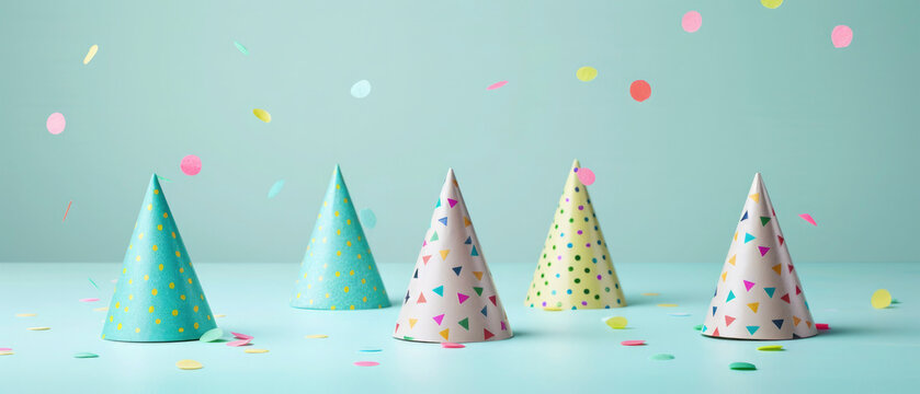 Closeup of pastell colorful celebartion hats isolated on pastell blue background with confettis, party, birthday, silvester, new year, christmas