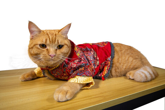 Orange cat wearing Chinese new year celebartion crouching on wooden table.
