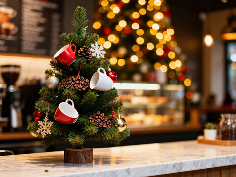 Christmas tree decorated with cups of coffee and coffee beans in a caffe. Text space