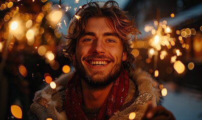 Cheerful man with santa hat and festive glasses celebrates holiday spirit