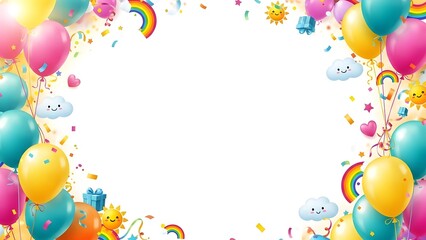 Multicolor balloon, cloud, sun, and rainbow border frame for celebratory event. Happy birthday or party invitation design element with space for text.