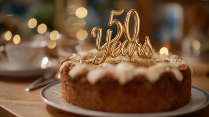 A close-up of a “50 Years” engraved cake topper glowing under warm lights, marking a milestone anniversary with elegance and tradition. cinematic color correction, natural uneven lighting yet