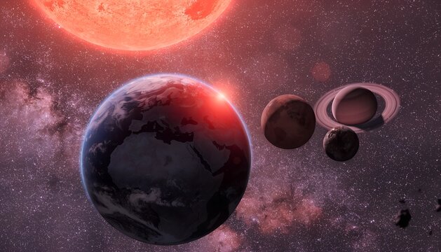 Planetary alignment across a cosmic background showcasing vibrant colors in a celestial display