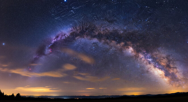 A stunning, wide-angle panoramic astrophotography shot capturing the dramatic, luminous arc of the Milky Way galaxy