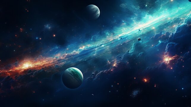 Vibrant abstract space background with cosmic planets and celestial elements
